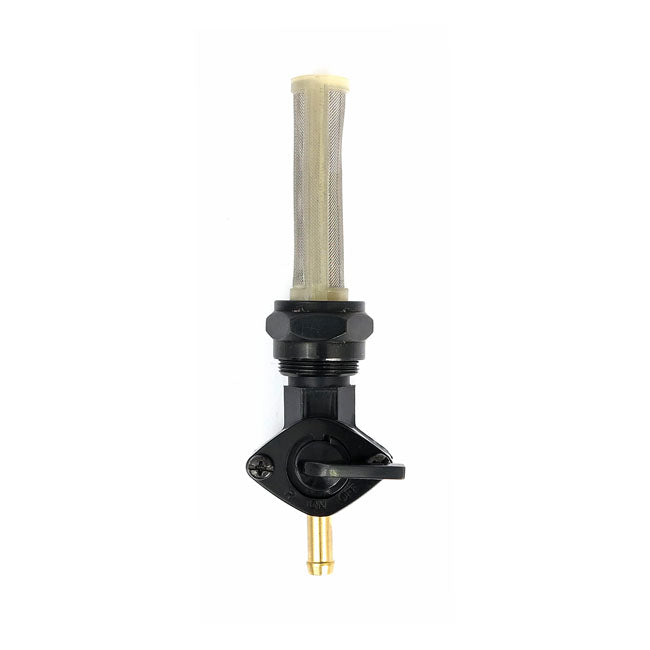 Black; down outlet; 1/4" (6.35mm) fuel hose; with filter & reserve; 22mm thread with nut Fits: 75-06 B.T., XL(NU) (excl. inj. models); customs with 75-up style threaded tanks Units: 1